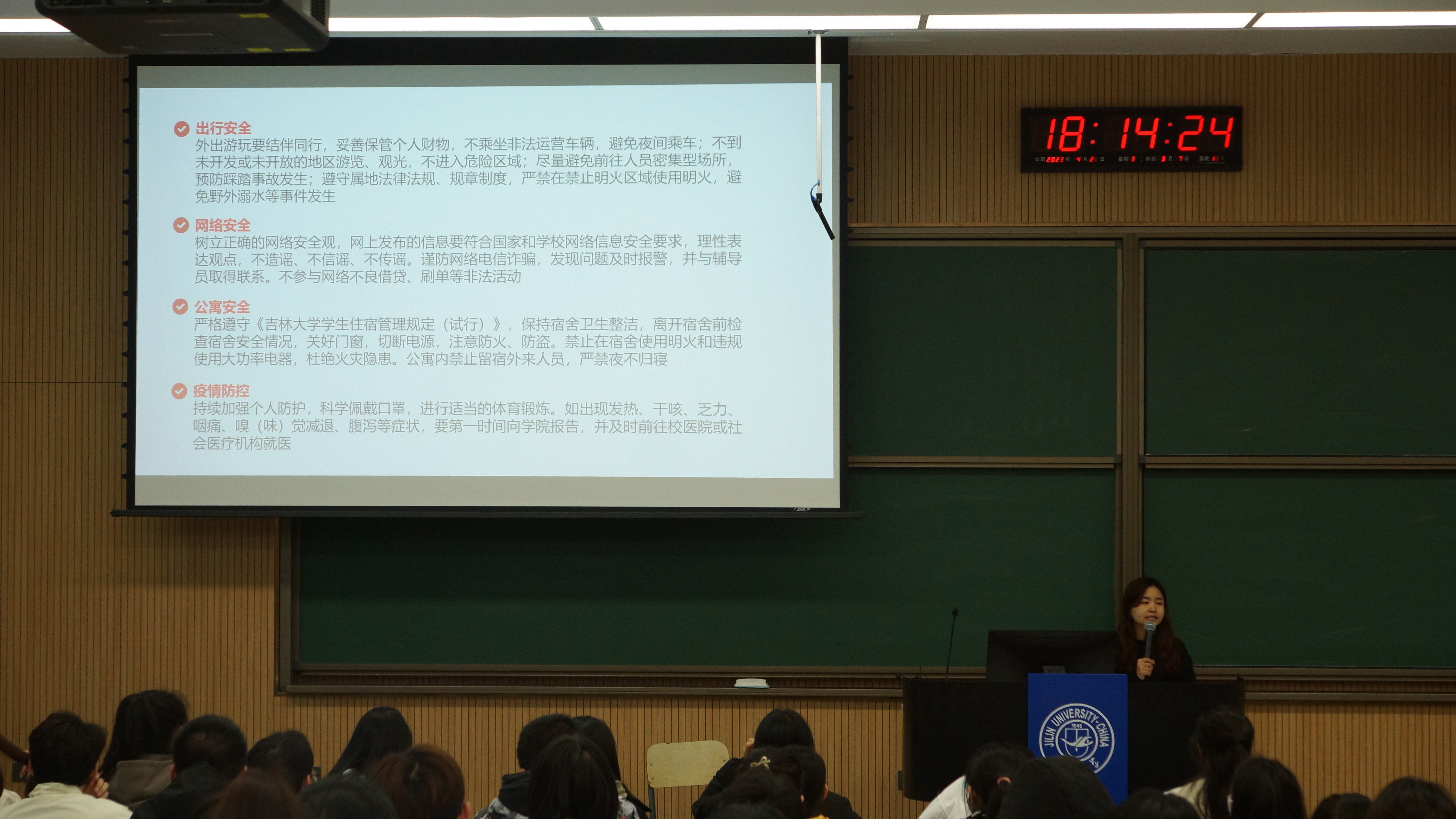 为进一步做好五一假期学生安全教育和校园安全管理工作,增强学生的安全意识和自我保护意识,4月26日晚,pa集团官网入口2021级、2022级本科生年级大会于和平校区科学讲堂100阶梯教室召开,会议由辅导员高梦玉主持,2021级、2022级全体学生参加此次会议。