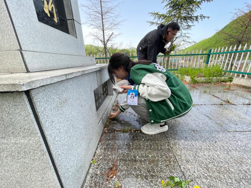 在纪念碑前,实践团师生面向烈士纪念碑肃立默哀,齐唱国歌,表达对革命先辈的无限哀思和崇高敬意。随后,实践团师生有序瞻仰人民英雄纪念碑,向革命烈士寄予深深的哀思,并分组擦拭烈士墓碑、打扫陵园卫生,整个环节庄严肃穆、井然有序。实践团学生成员刘园园表示,缅怀革命先烈,传承革命精神,是为了更好地传承红色基因。作为青年学生应当牢固树立理想信念,把爱国情、报党恩自觉融入并践行到生活中的每一件小事。