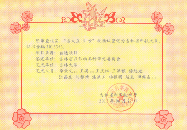 中早熟品种,生育日数119天。亚有限结荚习性,株高90.4厘米,主茎型,节间短,结荚均匀,荚密集, 三、四粒荚多,荚熟褐色。尖叶、紫花、灰色茸毛,籽粒圆形,种皮黄色略有光泽,种脐黄色,百粒重20.7克,蛋白质含量34.88%,脂肪含量24.09%。籽粒品质优良,无褐斑粒,完全粒率较高。经鉴定圃自然诱发鉴定表明,高抗大豆花叶病毒病,抗大豆灰斑病,抗大豆褐斑病,高抗大豆霜霉病,高抗大豆细菌性斑点病,感大豆食心虫。抗逆性强,含油量高,丰产性、稳产性好。2012年,省区试平均公顷产量2540.6公斤,2012年,省生试平均公顷产量2635.5公斤。