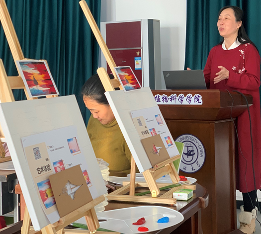 活动第二项,邀请长春首家成人画室创办人张乔老师到学院授课,为大家讲授油画作画方法、基本工具使用、作品色彩的填充等基本技法,并指导每名老师完成一幅油画。张乔老师还与学院教师共同完成了一幅《长城》的油画作品。抛开外界的吵闹、放下繁重的科研工作,随着画笔与颜料,学院女教师从零开始,一支笔,一屡画布,度过了一段美丽的时光。