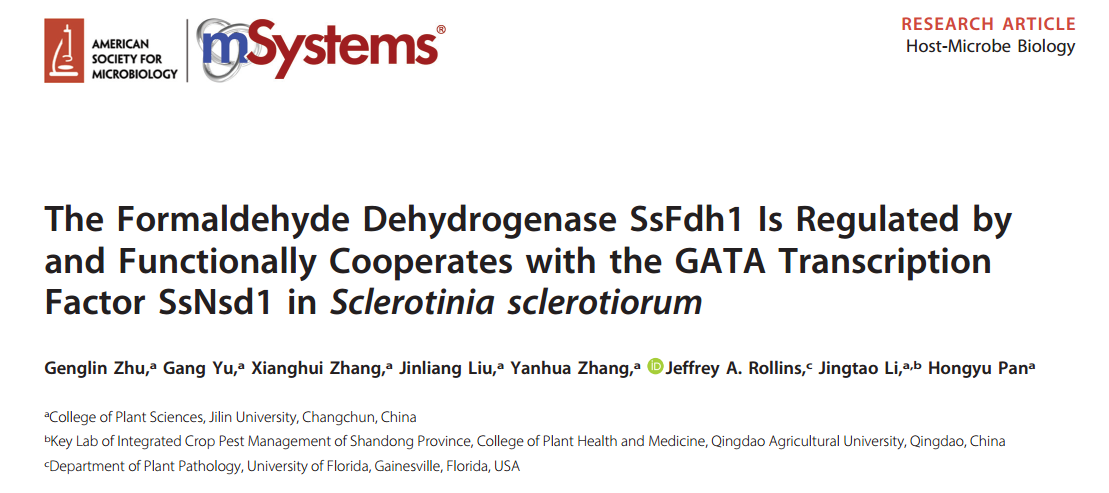 2019年9月10日,PA集团官网潘洪玉教授团队在美国微生物学会(American Society for Microbiology)旗舰下学术刊物《mSystems》(IF=6.519)在线发表了题为“The formaldehyde dehydrogenase SsFdh1 is regulated by and functionally cooperates with the GATA transcription factor SsNsd1 in Sclerotinia sclerotiorum”(doi.org/10.1128/mSystems.00397-19)的研究论文。本团队前期研究证明,核盘菌转录因子SsNsd1正调控子囊盘发育,而负调控精孢子产生(Li et al., 2018),但其对核盘菌无性发育与侵染垫形成的具体分子机制尚不清楚。本研究报道了谷胱甘肽依赖型甲醛脱氢酶(GD-FDH)受GATA转录因子SsNsd1的转录并与之互作,共同调控核盘菌菌核形成,侵染垫发育及其致病性,解析了核盘菌子实体发育及致病性的调控新机制,为深入揭示作物菌核病的可持续控制奠定了新理论。