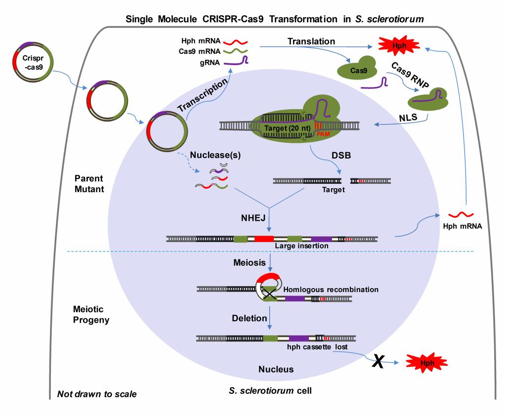 核盘菌(S.sclerotiorum)是引起作物菌核病的一种重要的植物病原真菌。其寄主范围极广,病害易流行。pa集团官网入口潘洪玉教授带领的“作物重大病害流行预警及其绿色综合防控关键技术研究”吉林省重大科技研发人才团队,多年来致力于核盘菌致病和发育分子机理的研究。然而,基于传统的基因突变技术(同源重组、基因沉默、T-DNA插入及UV诱变)存在效率低、不稳定等问题,制约了核盘菌致病基因功能的研究,因此,急需开发新的、高效、经济及简便的基因突变技术。CRISPR技术是在上个世纪九十年代初发现的并在近几年迅速成为人类生物学、农业和微生物学等领域最流行的基因编辑工具。该论文报道了核盘菌CRISPR-Cas9介导的基因编辑策略及该技术在核盘菌未知基因功能领域的应用。该研究发现将编码Cas9、靶标sgRNA和标记基因的质粒转化到核盘菌中后,可对靶标基因造成高频率的插入突变。研究发现核盘菌在Cas9蛋白造成靶基因双链断裂(DSB)后,并在非同源末端修复(NHEJ)机制下将降解的质粒片段随机组合并整合到DSB位点,造成大片段插入的靶基因突变。因此,筛选标记(HygB)的辅助下,即可以获得含HygB抗性的插入突变体。该研究还发现,随机整合的大片段在同源序列存在的情况下,经核盘菌有性生殖阶段会因同源重组而发生片段丢失,因此又可以在子囊孢子中筛选到HygB抗性丢失的子代突变体。该编辑体系模型在三个独立的核盘菌野生型上进行了验证,并实现了对草酸相关基因(SsOah1)及黑色素相关基因(SsPks13)进行了高效突变。该研究结果不仅进一步确定了草酸在核盘菌致病上的关键作用,还发现了其对菌核和侵染垫的数量也有重要影响;同时发现侵染垫的色素积累对核盘菌的侵染及致病性无显著影响。CRISPR-Cas9技术在核盘菌中的开发和运用将进一步推动核盘菌后基因组时代,也会加速核盘菌致病相关基因的挖掘与功能研究,对于快速鉴定核盘菌新的致病因子及最终实现病害防治具有重要意义。