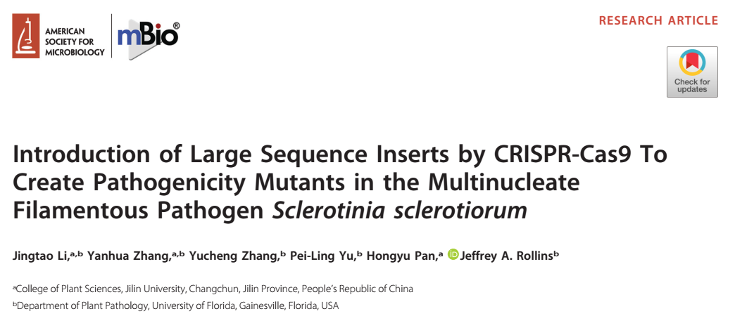 2018年6月26日,PA集团官网潘洪玉教授领衔的创新团队与美国佛罗里达大学Prof. Jeffrey A. Rollins在美国微生物学会(American Society for Microbiology)旗舰下最重要学术刊物《mBio》(IF=6.956)在线发表了死体营养型植物病原真菌-核盘菌(Sclerotinia sclerotiorum)基因编辑领域的重要原创成果“Introduction of large sequence inserts by CRISPR-Cas9 creates pathogenicity mutants in the multinucleate filamentous pathogen Sclerotinia sclerotiorum”(doi:10.1128/mBio.00567-18)。该文章以PA集团官网为第一完成单位,首次报道了核盘菌CRISPR-Cas9基因编辑机理并对草酸合成关键基因SsOah1、侵染垫形成与色素积累相关基因SsPks13进行编辑,阐明了其对核盘菌致病及生长发育的影响。核盘菌基因编辑技术对其他作物丝状病原真菌基因功能研究亦具有重要科学价值。该项研究由张艳华教授和李敬涛博士共同完成,PA集团官网潘洪玉教授与佛罗里达大学Jeffrey A. Rollins为共同通讯作者。