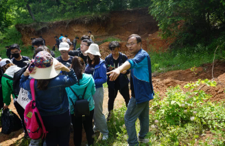 ▲秦建春教授带领本科生野外实习(左图)