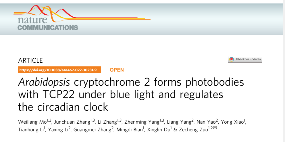 2022年5月12日,PA集团官网杨振明团队的左泽乘课题组在Nature Communications杂志上发表题为“Arabidopsis cryptochrome 2 forms photobodies with TCP22 under blue light and regulates the circadian clock”的研究论文,该研究首次解析了蓝光受体CRY2(Cryptochrome 2)在蓝光下调控生物钟的分子机制。