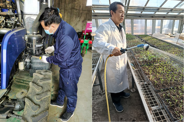 董桂军老师以电瓶三轮车为工具,往返田间和实践教学基地运输农资,积极主动配合基地的各项工作,包括机械作业、温室植物浇水、除草等。杨旭光老师充分发挥老同志的带头作用,除指导机械手挂接、调试、农机具外,还发挥自己的优势,主动调配农药和把关农艺标准。陈杰老师作为机械手始终考虑到师生试验田的重要性,无怨无悔,吃苦耐劳,好几次累得连饭都不想吃,为了抢农时,早上4:30就到田间镇压或喷洒除草剂,有时结合天气状况可能会持续到晚上10:00才收工。刘琳老师由于客观原因没能如期申请进校园,但承担了基地购买配件及生活物品等特殊任务,解决了春播的燃眉之急。