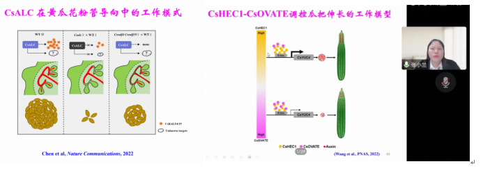 黄瓜是世界第三大蔬菜作物,我国是黄瓜生产大国,选育优质高产的黄瓜品种是黄瓜产业发展的重要目标。报告中张小兰教授围绕黄瓜器官发育生物学,首先介绍了CsFUL1和CsCRC如何调控黄瓜果实长度,为我们展示了黄瓜果实长度调控的基因网络。之后讲解了CsHEC1-CsOVATE模块调控生长素的合成来调控黄瓜瓜把的分子机制。最后介绍了CsALC和CsSPT介导花粉管延伸来调控黄瓜雌蕊育性,以期对黄瓜的品质改良和种质创新提供参考。以上研究内容在Plant Cell、PNAS、Nature Communications以及Plant Physiol等高水平期刊上发表,张小兰教授全面系统的工作和精彩的讲解为我们带来了一场科研盛宴。同时张小兰教授指出育种是园艺产业永恒的需求,蔬菜产业竞争的核心之一就是种业的竞争,鼓舞参会的育种工作者从杂交育种和分子育种进入4.0时代的生物技术+人工智能+大数据信息的智能育种,并提出了黄瓜育种的模式,为园艺植物育种提供了参考。报告结束后,张小兰教授从实验设计、实验技术、实验思路以及实验室管理等多方面耐心细致地解答了参会老师和同学们提出的问题,并对参会的年轻人提出多思考,多看文献,增加知识面的中肯意见。