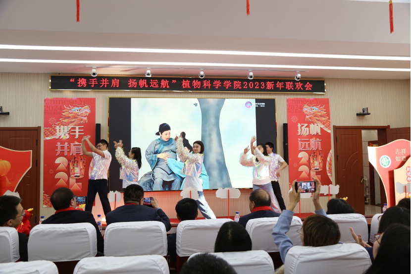 由学院师生共同精心准备,共同呈现了舞蹈《桃花朵朵开》、小合唱《光阴的故事》、民乐合奏《茉莉花》和歌曲《我爱你中国》等四个节目。师生互动、异彩纷呈,每个节目都获得了现场热烈的欢呼和持续不断的掌声。