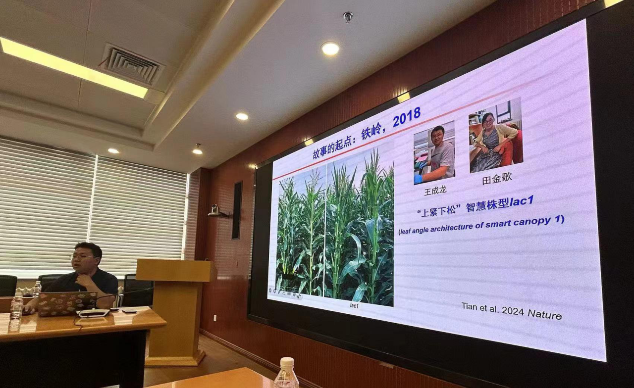 在教育方式的探讨之后,中国农业大学的王成龙老师为我们带来了玉米密植与高产的研究进展展示。玉米作为全球重要粮食作物,提高其产量已成为当务之急,由于我国耕地面积的限制,增加种植密度被认为是提高产量的有效途径,王成龙老师围绕促进玉米密植增产的智慧冠层基因的发现和探究进行汇报,通过对玉米株型的遗传学研究,特别是叶夹角的分析,识别了影响玉米密植产量的关键基因与遗传调控机制。面对同学和老师的提问,王老师认真耐心地一一回答。不仅严密的实验设计和丰硕的实验成果让同学们受益匪浅,王成龙老师亲切认真的态度也给同学们留下了深刻印象。