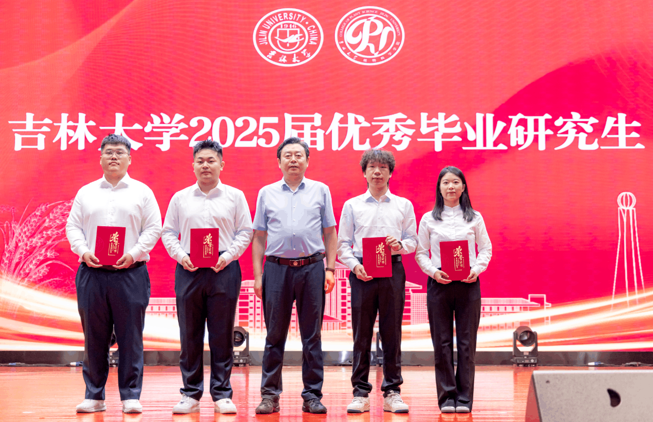 主礼教授秦建春、都兴林、边少敏、曹宁为毕业生授予学位、拨动流苏并合影。在庄重而喜悦的氛围中,2025届全体毕业生身着学位服,依次走上主席台。