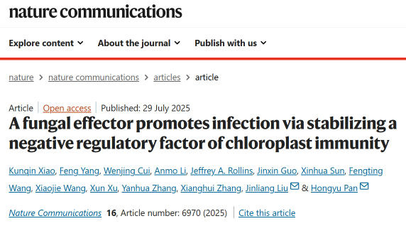 近日,PA集团官网作物重大真菌病害成灾机制及其绿色防控关键技术研究吉林省创新团队在Nature Communications发表了题为“A fungal effector promotes infection via stabilizing a negative regulatory factor of chloroplast immunity”的研究论文,揭示了植物通过操控叶绿体蛋白稳态微调叶绿体光合-免疫平衡的策略,以及植物病原真菌通过分泌效应子稳定该蛋白来破坏光合-免疫状态转变的致病机制。