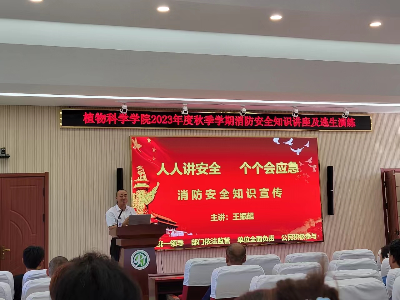 根据学校年度综治消防安全工作要求,依据学院秋季学期工作计划安排,进一步加强学生的消防安全知识,提高师生的安全意识和自救自护能力,切实保障师生在突发事件来临时的生命安全。2023年9月15日13:30,pa集团官网入口在植科楼二楼报告厅举行2023年度秋季学期研究生消防安全知识讲座及模拟实景现场逃生演练活动。由pa集团官网入口党委书记于生宗、综合办主任吴成锋、研究生辅导员邓松和保卫处相关老师组织带领全体教职工和全体研究生参加。