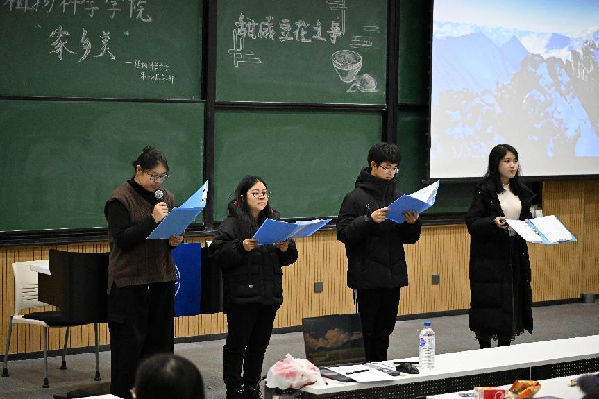 11月18日晚七点,本次活动在祖国大地广袤河山背景视频的播放中拉开序幕。个人分享环节来自全国各地的九位同学们先后介绍了自己美丽的家乡、难以忘怀的家乡美食:辽阔无边的内蒙古引人入胜、新疆美食令人垂涎欲滴、独具特色的山东高唐老豆腐朴素地道、“黄金”福地莱州人才辈出、油画般的山东威海水秀山明、“东方小巴黎”哈尔滨恍若童话、“一清二白三红四绿”的拉面甘旨肥浓、“马踏飞燕”甘肃武威历史悠长、地处东北特产丰富的四平物阜民安。