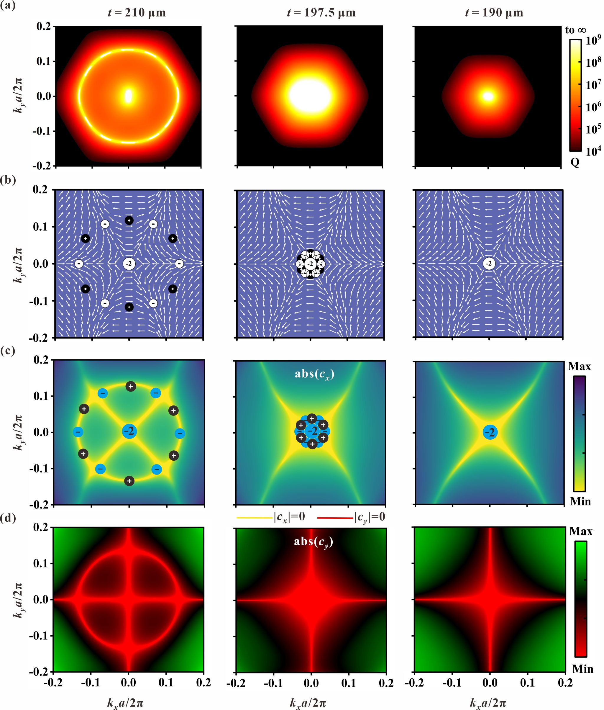 近年来,连续域束缚态(Bound states in the continuum,BIC)这一概念的出现为实现具有超Q因子的周期性光学系统提供了一个难得的切入点。融合多个BIC可以抑制面外辐射损耗以进一步提高共振态的Q因子。研究团队利用BIC独有的拓扑特性,使得12个偶然BIC与高阶对称保护BIC在动量空间中心发生融合。融合后的BIC在宽谱范围内增强了Q因子,并且对制造缺陷引入的辐射损失表现出鲁棒性。该工作可以大大增强超表面中光-物质相互作用,为太赫兹功能器件性能的优化提供了一种全新方案。