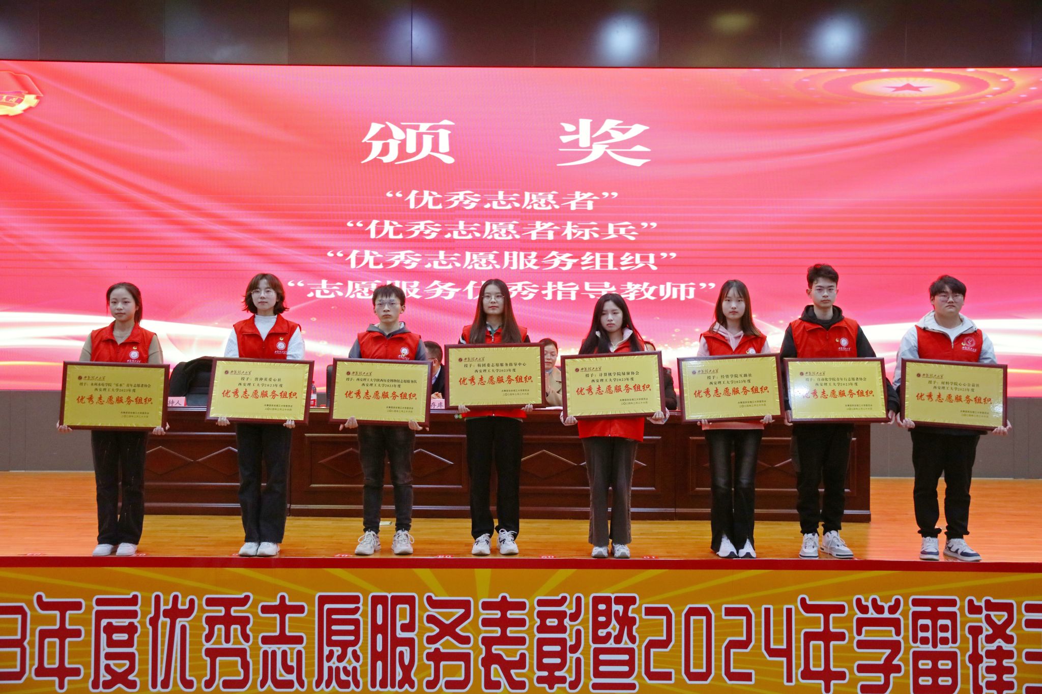 会上,党委宣传部常务副部长陈梅宣读了《关于命名表彰2023年度beat365正版唯一官网必一学雷锋活动示范点和岗位学雷锋标兵的决定》《关于表彰2023年beat365正版唯一官网必一“优秀志愿者”“优秀志愿者标兵”“优秀志愿服务组织”“志愿服务优秀指导教师”的决定》,学生工作部副部长郭瑞鹏宣读了《关于开展beat365正版唯一官网必一2024年“学习二十大 永远跟党走 青春志愿行”学雷锋志愿服务活动的通知》,校团委书记金永升对2023年学校志愿服务工作进行了总结回顾,保卫处处长卢小卫、后勤处副处长牟晓成为新建志愿服务队授牌。校志愿服务指导中心学生干部代表吕洋涛同学就开展好雷锋月活动发出了倡议。