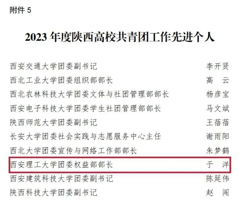 近日,共青团陕西省委、中共陕西省委教育工委联合印发《关于2023年度陕西高校共青团工作述职评议结果的通报》,beat365官网团委荣获“2023年陕西高校共青团工作优秀单位”称号,校党委常委、副校长张存库获“2023年陕西高校支持共青团工作好书记(校长)”称号,校团委于洋获“2023年陕西高校共青团工作先进个人”称号。陕西省学生联合会印发《关于2023年度陕西学联学生会组织工作述职评议结果的通报》,beat365官网学生会荣获“2023年度陕西省标兵学联学生会组织”,校学生会马文娟、史磊,校研会杨晨曦获“2023年度陕西省学联学生会先进工作个人”。