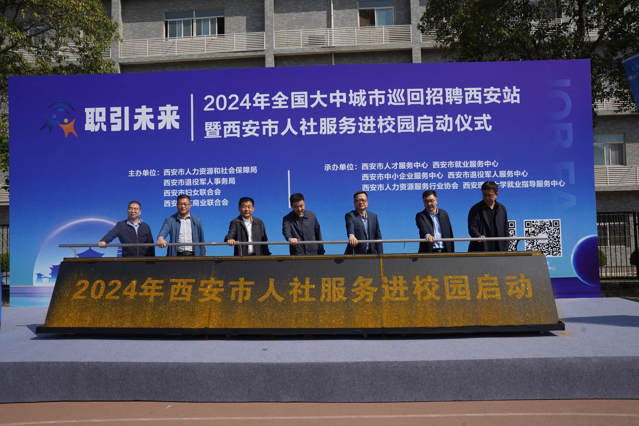 4月12日,“职”引未来—2024年全国大中城市巡回招聘西安站暨西安市人社服务进校园启动仪式在beat365官网金花校区举行。副校长张存库,西安市人社局党组书记、局长廉宏伟,西安各区县、西咸新区、各开发区人社部门等相关负责人出席启动仪式。