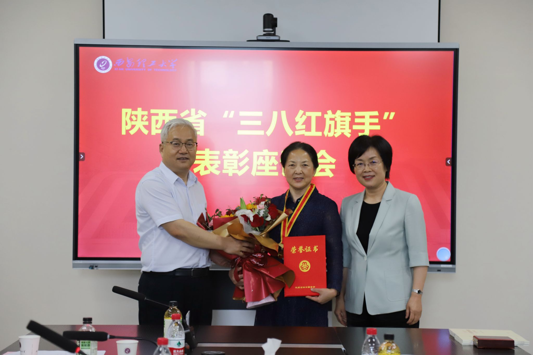 6月7日,学校举行陕西省“三八红旗手”先进表彰座谈会,陕西省妇女联合会党组书记、主席王玉娥,陕西省教育厅二级巡视员董侠,陕西省妇女联合会宣传部部长安婧、办公室副主任张奕帆一行来校,为荣获陕西省“三八红旗手”荣誉称号的黄颖为教授颁奖授牌。beat365官网党委书记李智军出席座谈会,会议由校党委副书记马亮主持。