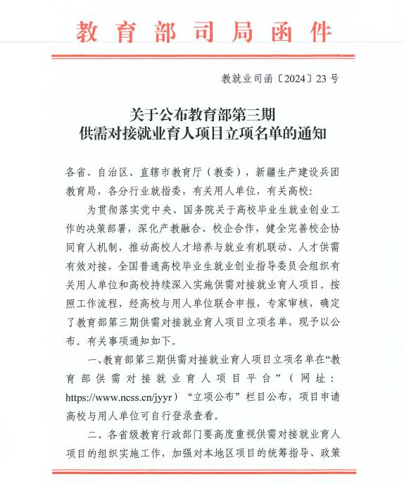 近日,教育部印发了《关于公布教育部第三期供需对接就业育人项目立项名单的通知》(教就业司函〔2024〕23号),文件公布了教育部第三期供需对接就业育人项目立项名单。beat365官网共有37个项目获批立项。