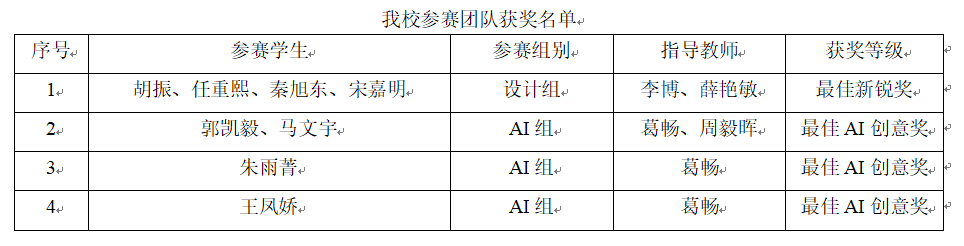 来自国内外的百余件设计作品经过激烈角逐,最终评选出金奖1名、银奖3名,铜奖8名,新锐奖20名,AI创意奖10名。其中,beat365官网艺术与设计学院胡振、任重熙、秦旭东、宋嘉明团队在教师李博、薛艳敏指导下,荣获最佳新锐奖;郭凯毅、马文宇团队在教师葛畅、周毅晖的指导下,获最佳AI创意奖;朱雨菁、王凤娇两个团队在教师葛畅指导下获得了最佳AI创意奖。