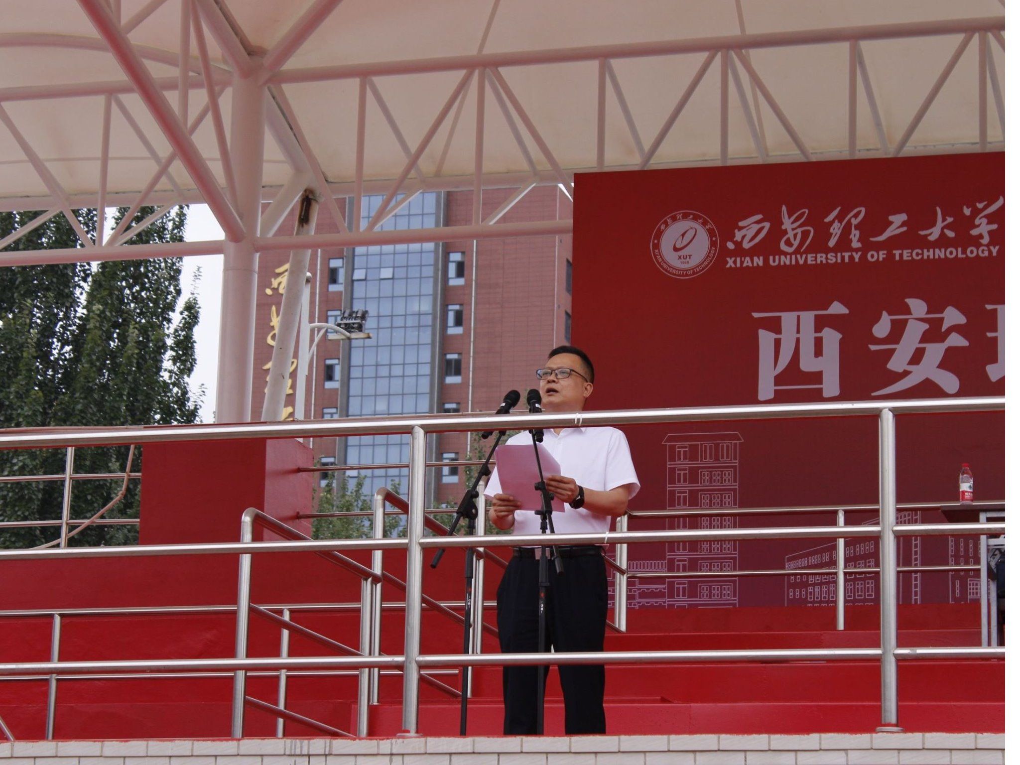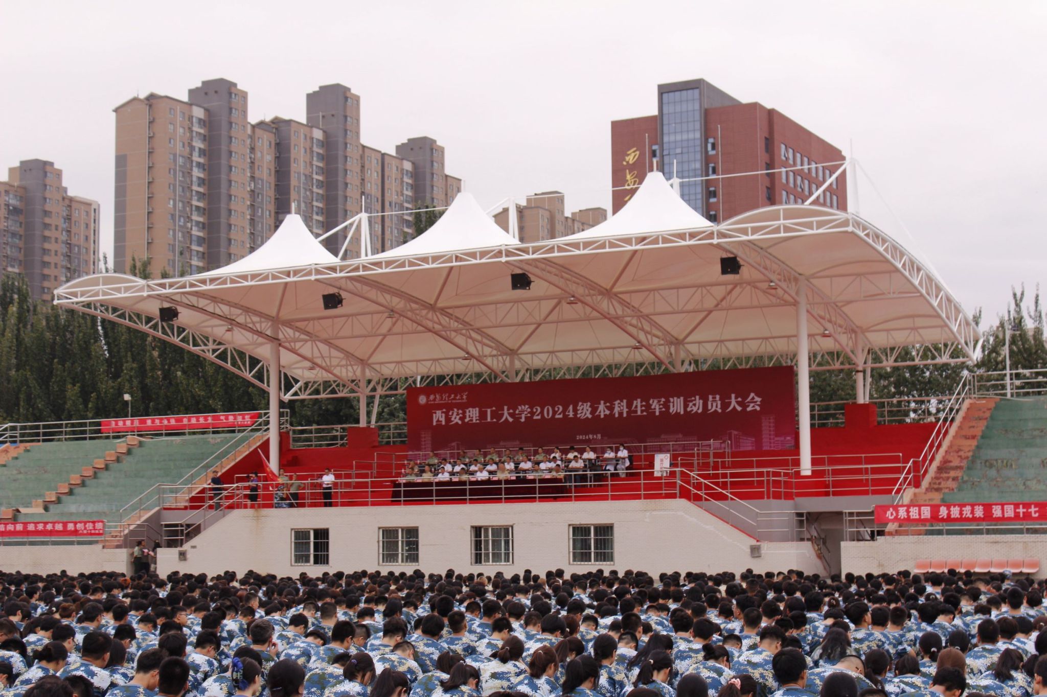 8月26日上午,beat365官网2024级本科生军训动员大会在曲江校区田径场举行。校党委书记李智军,校党委副书记、军训工作领导小组组长张存库,副校长黑新宏出席动员大会。