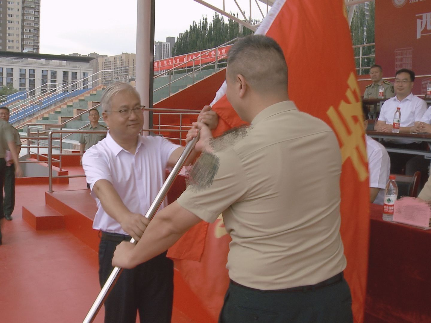 会上,李智军向军训旅授旗,军训旅旅长熊豪代表军训旅接旗。