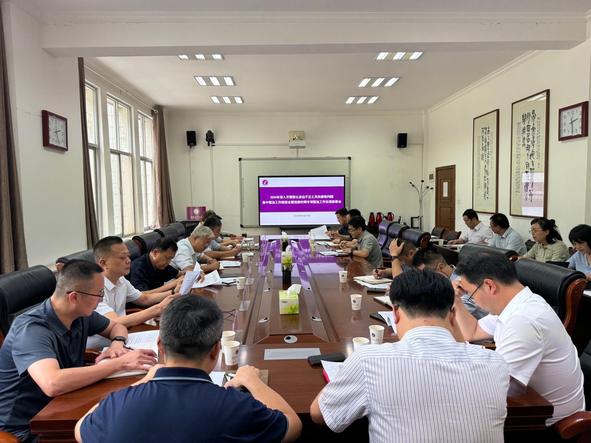 会议传达了上级有关集中整治和违规吃喝专项整治文件精神。通报了财务和后勤管理重点领域专项巡察和集中整治阶段性工作情况,并对两项整治工作具体安排。与会人员集体观看了违规吃喝问题警示教育片。