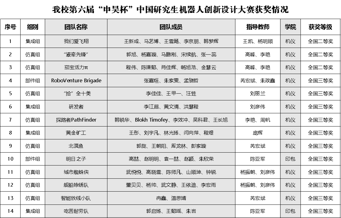 10月24-25日,“申昊杯”第六届中国研究生机器人创新设计大赛决赛在辽宁沈阳举行,beat365官网参赛研究生团队获全国二等奖3项、三等奖11项,以总得分全国第四获评优秀组织单位,获奖项数位列全国第三,综合成绩位居陕西高校第一,创参赛以来最好成绩。