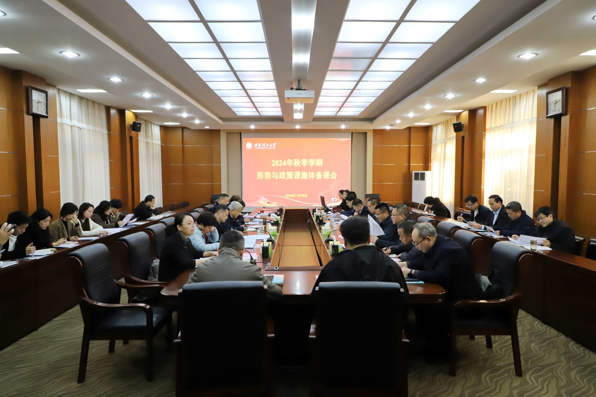 备课会上,马克思主义学院院长梁严冰通报2024年秋季学期形势与政策课教学计划安排;马克思主义学院形势与政策教研室主任鲁君介绍课程内容安排及授课思路。