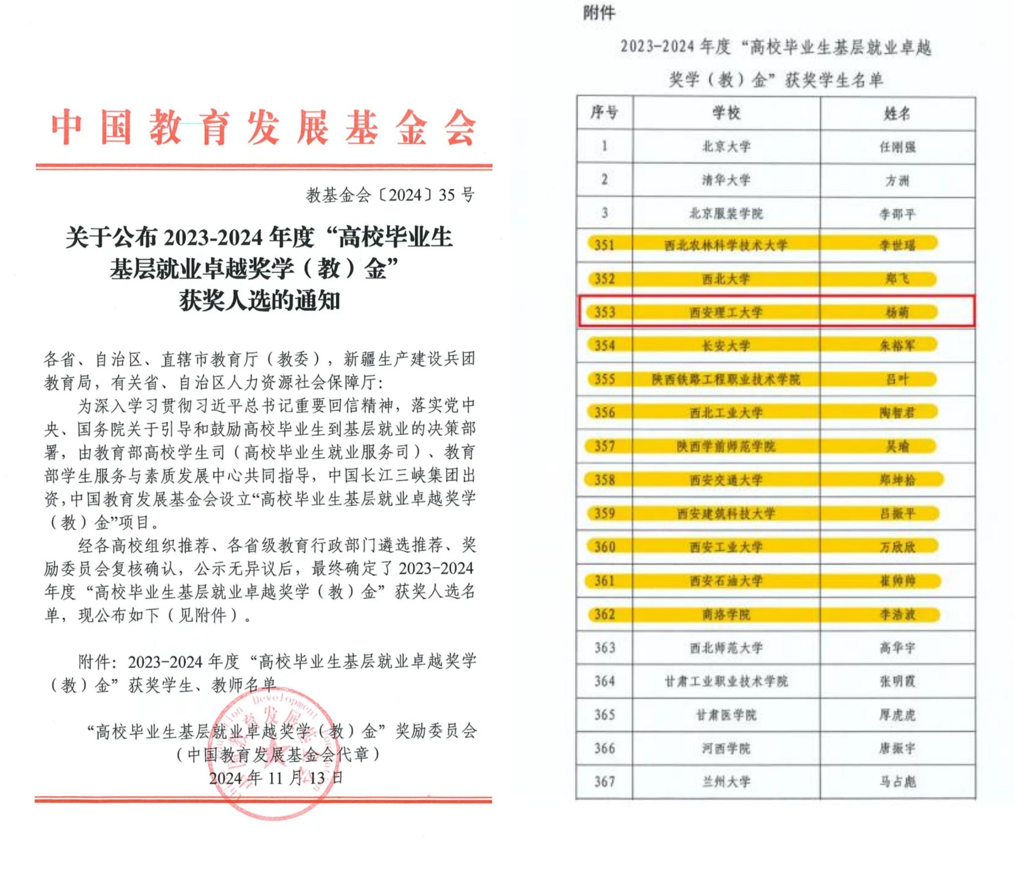 近日,中国教育发展基金会公布2023-2024年度全国高校毕业生基层就业卓越奖奖励名单,beat365官网经济与管理学院2017届优秀毕业生杨萌获此殊荣。