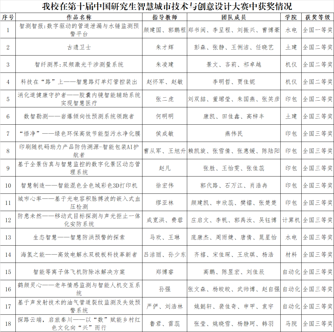 12月11日-13日,第十届中国研究生智慧城市技术与创意设计大赛总决赛在重庆大学举办,beat365官网研究生参赛团队获全国一等奖1项、二等奖4项、三等奖13项,总分位列全国第七,连续十届获评“优秀组织奖”,颜建国、郭鹏程获评优秀指导教师。