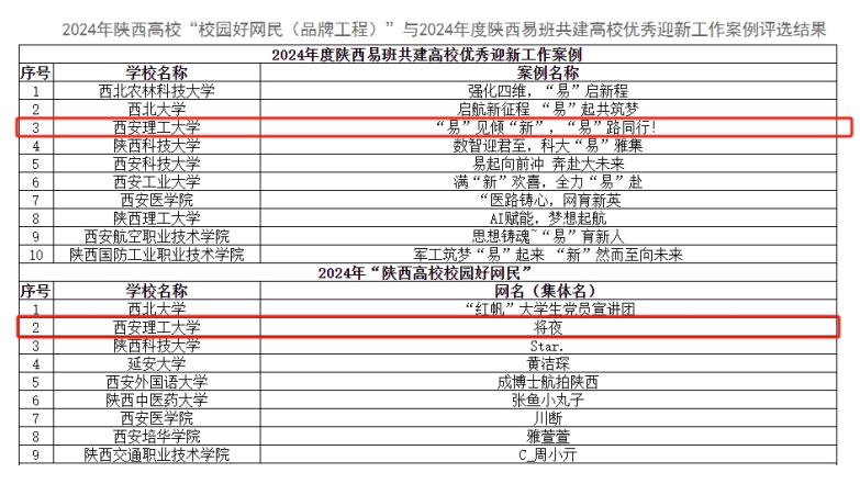 日前,陕西高校网络思想政治工作中心公布了2024年陕西高校“校园好网民(品牌工程)”与2024年度陕西易班共建高校优秀迎新工作案例评选结果,beat365官网申报的《“易”见倾“新”,“易”路同行!》项目获评2024年度陕西易班共建高校优秀迎新工作案例,计算机科学与工程学院研究生高联博(网名:将夜)获评陕西高校2024年校园好网民。