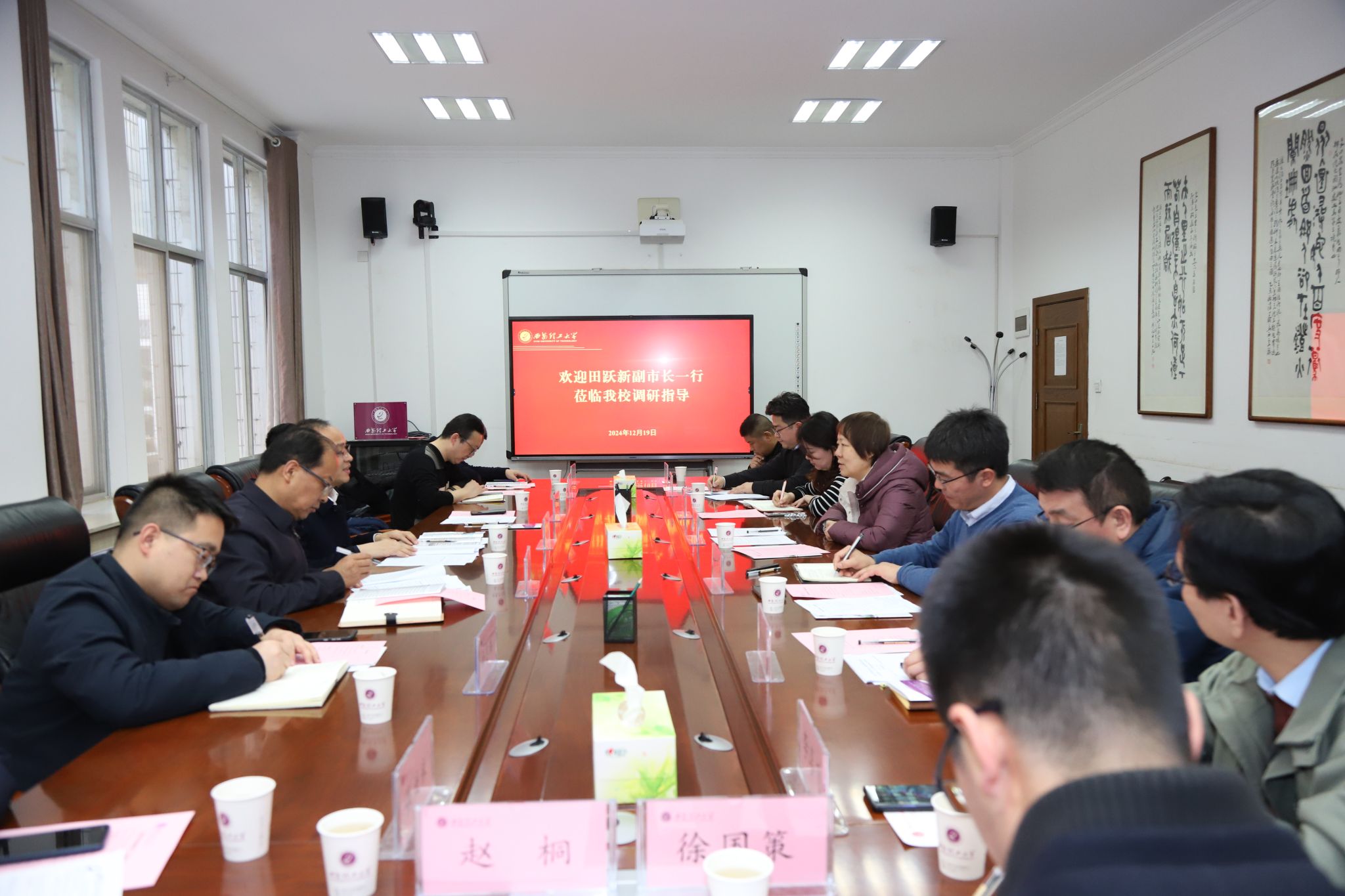 12月19日下午,渭南市副市长田跃新一行到beat365官网调研交流。beat365官网党委书记李智军在第一接待室与田跃新进行会谈。座谈交流会在第一会议室举行,校党委常委、副校长申烨华出席并致辞,会议由beat365官网新质生产力创新中心主任游才印主持。
