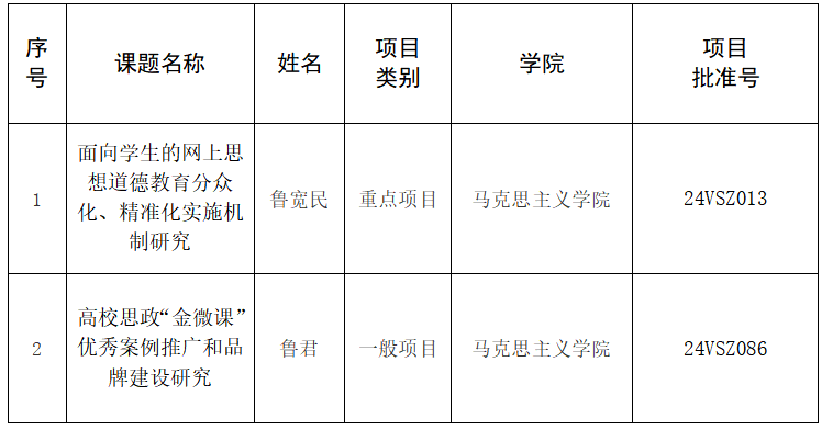 马克思主义学院鲁宽民老师申报的《面向学生的网上思想道德教育分众化、精准化实施机制研究》获批重点项目。该项目致力于探索在互联网时代背景下,如何更有效地针对学生进行分众化和精准化的思想道德教育,以适应新时代学生群体的多元化需求。