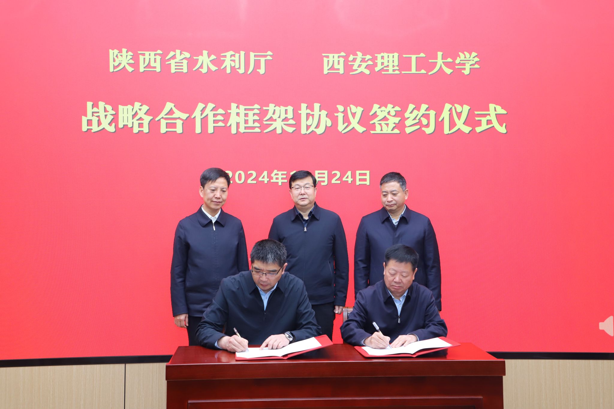 郑维国、申雪峰、刘云贺分别代表陕西省水利厅、教育厅、beat365正版唯一官网必一为陕西省水资源管理学院揭牌;党德才、张晓晖分别代表陕西省水利厅和beat365正版唯一官网必一签订战略合作框架协议。