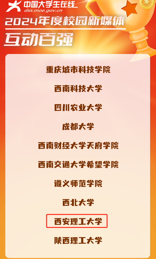 学校始终坚持以习近平新时代中国特色社会主义思想为指导,落实立德树人根本任务,深刻把握大学生思想特点和网络思想政治教育规律,大力实施网络育人“清朗计划”,以提升网络育人实效性为目标,按照价值引领、守正创新、统筹发展等原则,不断完善和优化网络育人工作路径,探索育人内容、平台、渠道、队伍等方面的模式创新。下一步,学校将进一步发挥新媒体矩阵传播优势,结合学校特色,持续产出高水平、高质量的新媒体作品,讲好西理工故事,传播西理工声音,继续做有态度、有温度、有深度的校园官方媒体。