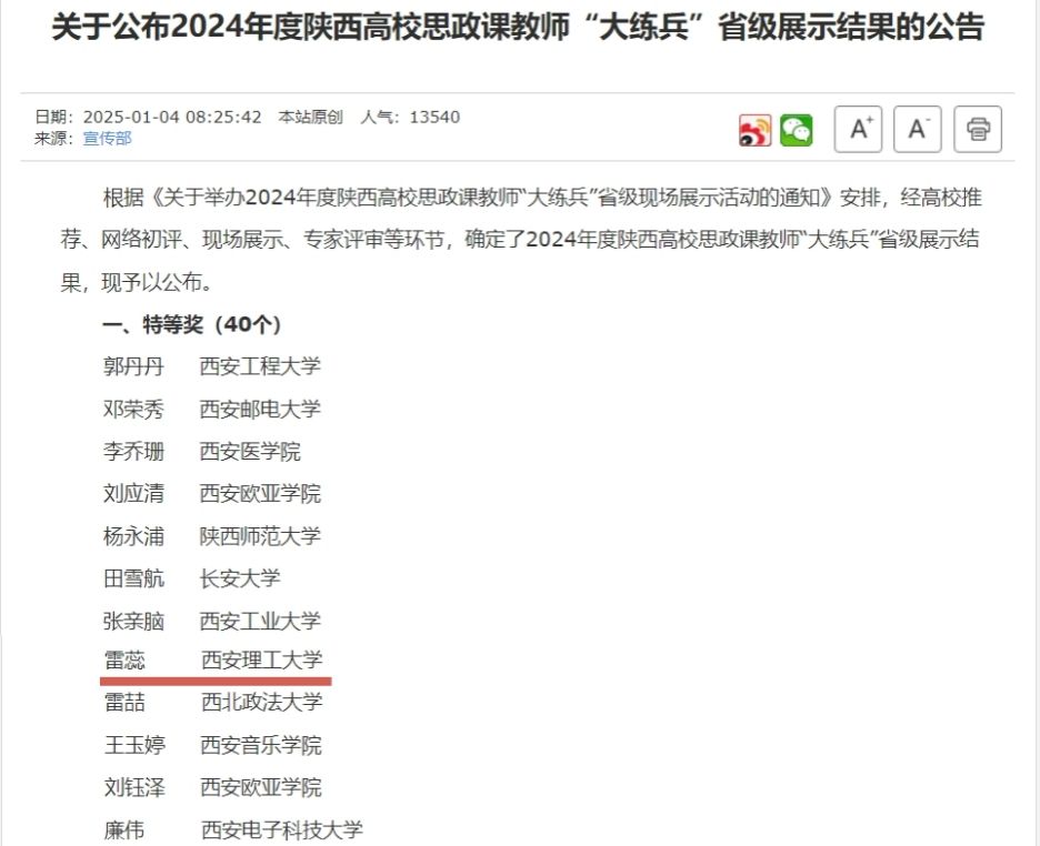近日,中共陕西省委教育工委、陕西省教育厅发布《关于公布2024年度陕西高校思政课教师“大练兵”省级展示结果的公告》,beat365官网马克思主义学院雷蕊老师获特等奖。