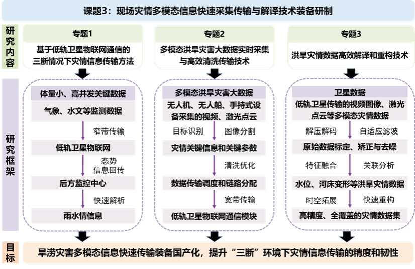 侯精明教授主持的“现场灾情多模态信息快速采集传输与解译技术装备研制”课题,国拨经费167万元。主要研制基于低轨卫星物联网系统窄带传输功能的通信模组,实现常规水文气象监测数据编解与传输;利用机器学习和图像处理技术对无人机、无人船采集的视频、激光点云等数据进行清洗、筛选,并基于低轨卫星互联网宽带传输功能构建大体量灾情数据快速传输策略;设计基于卫星数据特性的高效混合解压算法,采用直接线性变换、自适应滤波器和大气传输模型等方法对图像和点云等数据进行预处理,利用深度学习技术从多源数据中提取关键特征要素,开发灾情关键特征要素的智能解译算法,将采集的多模态洪旱信息通过特征融合与关联分析转换为水文、气象、河床变形等洪旱灾情数据,制定统一的灾情信息采集规范,对数据进行分类、标注、存储,形成高精度、系统化的灾情数据集,支撑应用与共享。为灾前预报预警、灾中快速精准研判和灾后复盘等防灾减灾救灾工作提供技术支撑。