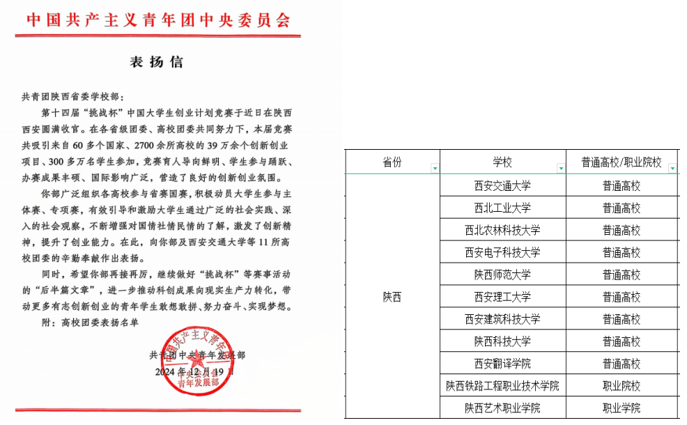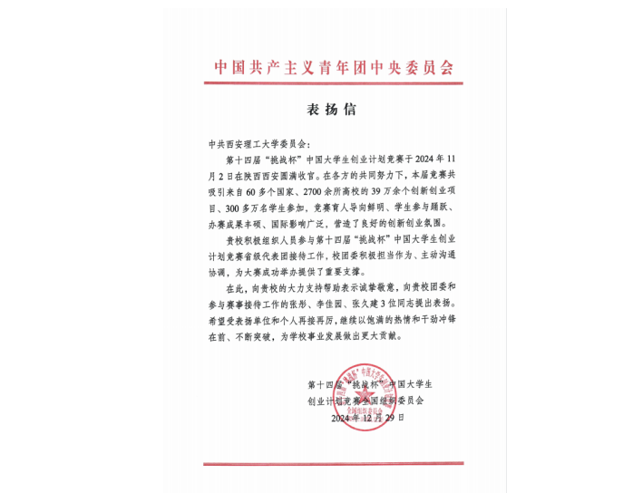 近日,beat365正版唯一官网必一先后收到共青团中央和第十四届“挑战杯”中国大学生创业计划竞赛主委会发来的表扬信,对beat365官网在第十四届“挑战杯”中国大学生创业计划竞赛中高度重视、积极动员、有效引导、不断增强对国情社情民情的了解,激发了创新精神,提升了创业能力,起到好的示范引领作用提出表扬,并对beat365官网积极组织人员参与第十四届“挑战杯”中国大学生创业计划竞赛省级代表团接待工作,校团委积极担当作为、主动沟通协调,为大赛成功举办提供了重要支撑表示感谢。