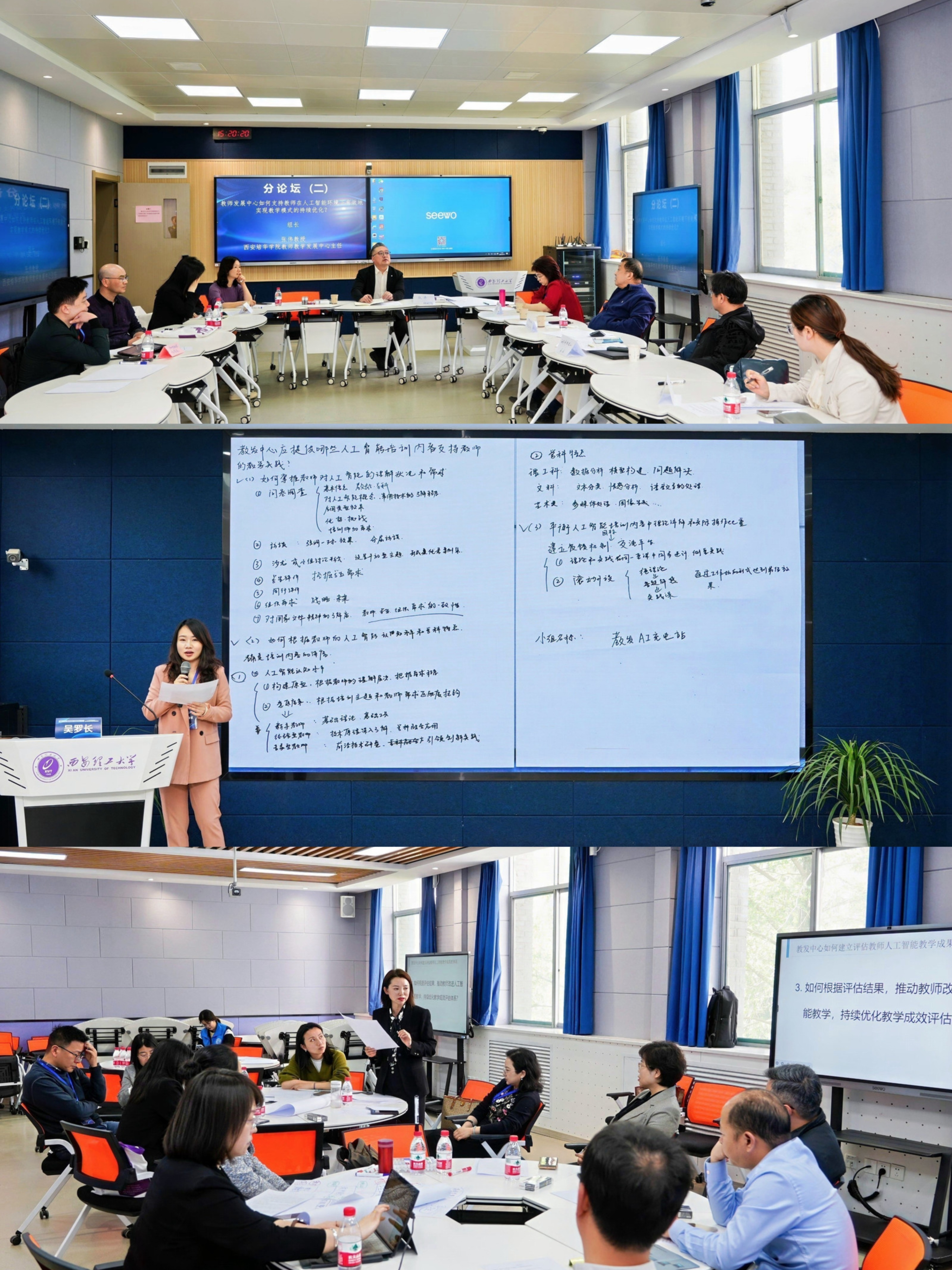 教发中心专题分享环节,温州大学教师教学发展中心主任宋占美教授、济南大学教师发展中心教师发展师马媛教授、beat365官网党委教师工作部部长兼人事处处长郭鹏程教授分别作专题报告。一线教师专题分享环节,中国地质大学(北京)孟俊教授、beat365官网自动化与信息工程学院杨莺教授分别作专题报告。教发主任圆桌论坛聚焦“教发中心如何提升教师AI应用能力与教学方法创新”“教发中心如何支持在AI时代下的教师角色转变与专业发展”等主题展开讨论。AI赋能教学改革主题研讨会上围绕“教师发展中心应提供哪些人工智能培训内容支持教师的教学实践?”“教发中心如何支持教师在人工智能环境下有效地实现教学模式的持续优化?”等主题展开讨论。教师发展师社群活动上,参会老师以“共话成长之路:教师发展师的蜕变与升华”为主题,以多元互动形式深化跨校协作。