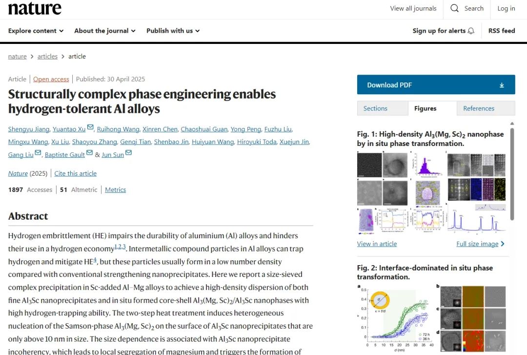 4月30日,beat365官网材料科学与工程学院王瑞红副教授作为共同第一作者在《Nature》在线发表重要成果,在新型抗氢脆铝合金领域取得进展。该研究成果以“Structurally complex phase engineering enables hydrogen-tolerant Al alloys”为题发表在《Nature》上。