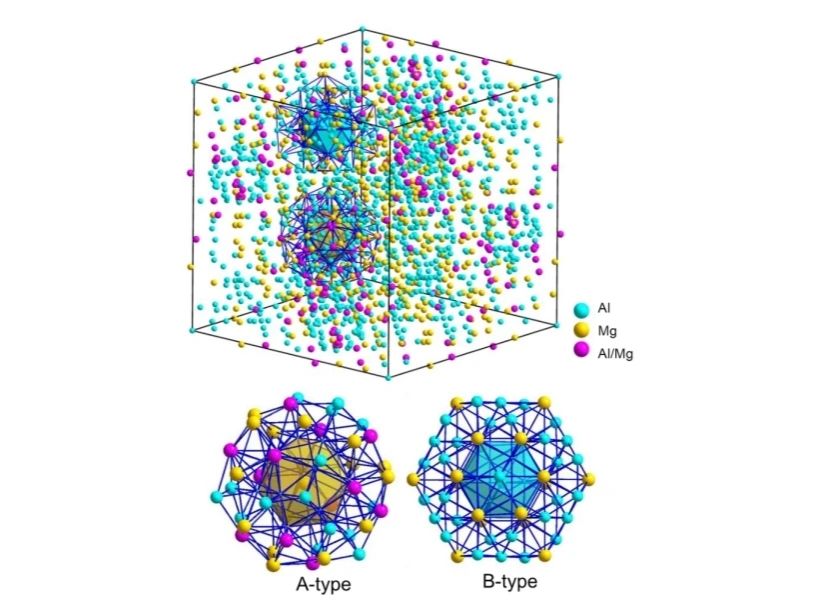 图1 Samson-Al3Mg2复杂金属相单胞的晶体结构示意图(上图)及其结构描述的原子团簇模型示意图(下图: A型与B型原子团簇)。图中粉色位置代表可被Al或Mg随机占位。