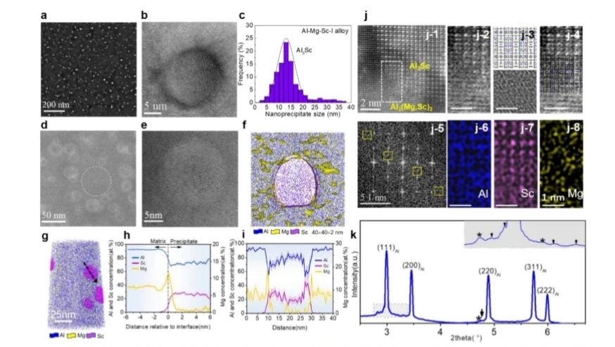 图2 (a-c) 第一步热处理形成的高密度Al3Sc纳米颗粒的低倍和高分辨TEM照片以及尺寸统计分布图;(d,f) 第二步热处理形成的核壳结构Al3(Mg,Sc)2/Al3Sc复合纳米相的低倍和高分辨TEM照片;(f-i) 三维原子探针(APT)表征复合纳米相壳层的高Mg含量;(j, k) HAADF-STEM以及同步辐射表征技术确定Al3(Mg,Sc)2壳层的Samson相结构。