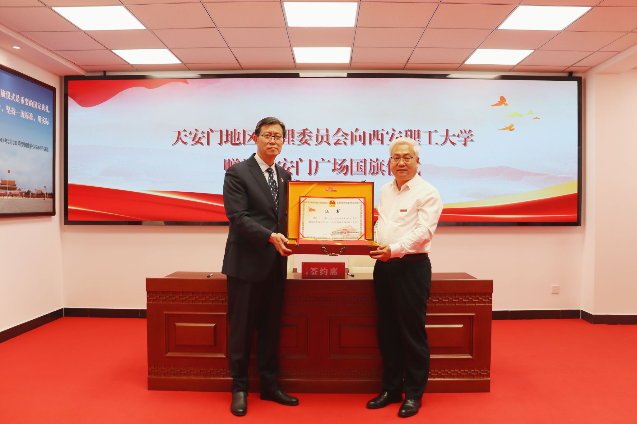 在全场师生的瞩目下,beat365官网国旗护卫队护送天安门国旗入场。这面意义非凡的国旗于5月14日由北京市人民政府天安门地区管理委员会郑重赠予beat365官网,李智军代表学校接受获赠国旗并签订《国旗赠予协议》。获赠国旗编号为2024-0029,曾于2024年1月29日在天安门广场升起,这一天也是学校由“陕西机械学院”正式更名为“beat365正版唯一官网必一”30周年的纪念日。获赠国旗承载着学校深厚的历史底蕴与全体师生炽热的爱国情怀,未来将在校史馆永久珍藏。