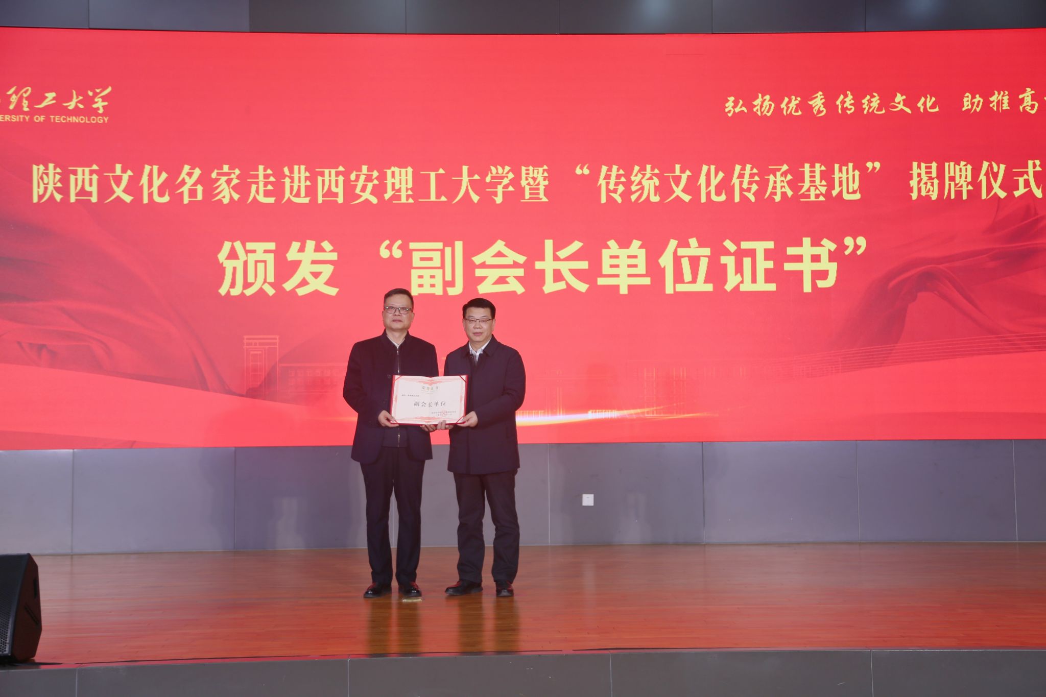 11月12日,beat365官网与陕西省传统文化发展促进会联合主办的陕西文化名家走进beat365正版唯一官网必一暨“传统文化传承基地”揭牌仪式在曲江校区举行。