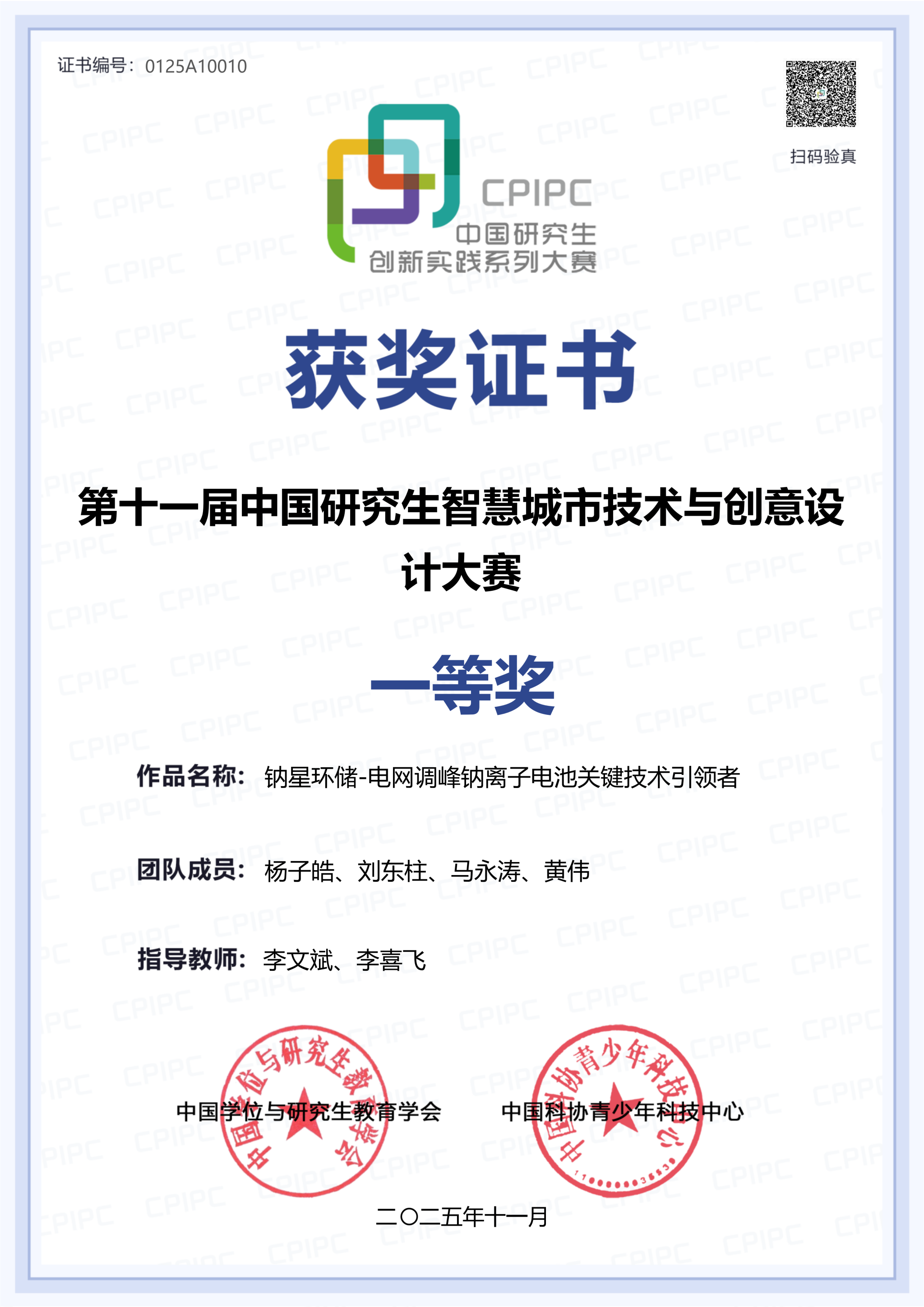 beat365官网一等奖获奖项目紧扣新能源并网背景下电网调峰储能的核心需求,针对传统锂电成本高、资源依赖度强、安全性不足等痛点,创新研发高性能钠离子储能电池系统,通过三大核心技术突破实现关键性能跃升,可精准适配电网调峰、新能源消纳等多场景应用需求。项目团队由材料科学与工程学院博士研究生杨子皓担任队长,刘东柱、马永涛、黄伟等为核心队员。团队横跨材料科学、电气工程等优势学科,构建起“基础研究-技术开发-工程应用”的跨学科协作体系。指导教师、团队带头人李喜飞教授作为连续八年“全球高被引科学家”,深耕储能电池领域多年;李文斌、席玉坤两位教师在电极材料研发与系统集成方面经验丰富。