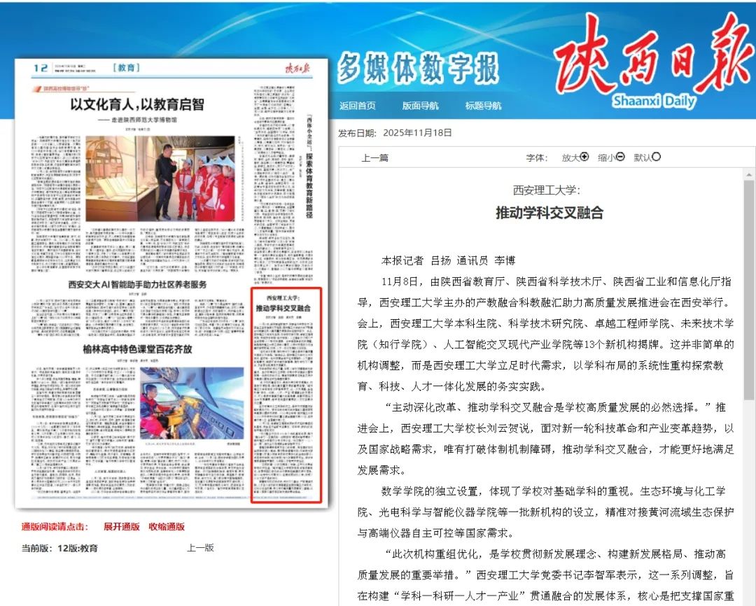 11月13日,科技日报以《beat365正版唯一官网必一:以学科重构推动教育科技人才一体改革》为题,深度解码beat365正版唯一官网必一学科系统性布局;11月17日,陕西卫视新闻联播再以《beat365正版唯一官网必一一体推进教育科技人才改革发展激发创新创造创业活力》为题,报道beat365正版唯一官网必一布局学科融合,应对黄河流域生态保护、人工智能、高端仪器的产业需求;11月 18日,陕西日报再以《beat365正版唯一官网必一:推动学科交叉融合》跟进聚焦,三大权威媒体相继发声,与此前30家中央省市媒体的集中报道形成呼应,500万+全网阅读量的热度背后,是社会各界对西理工冲刺“双一流”的高度关注与深切期许。