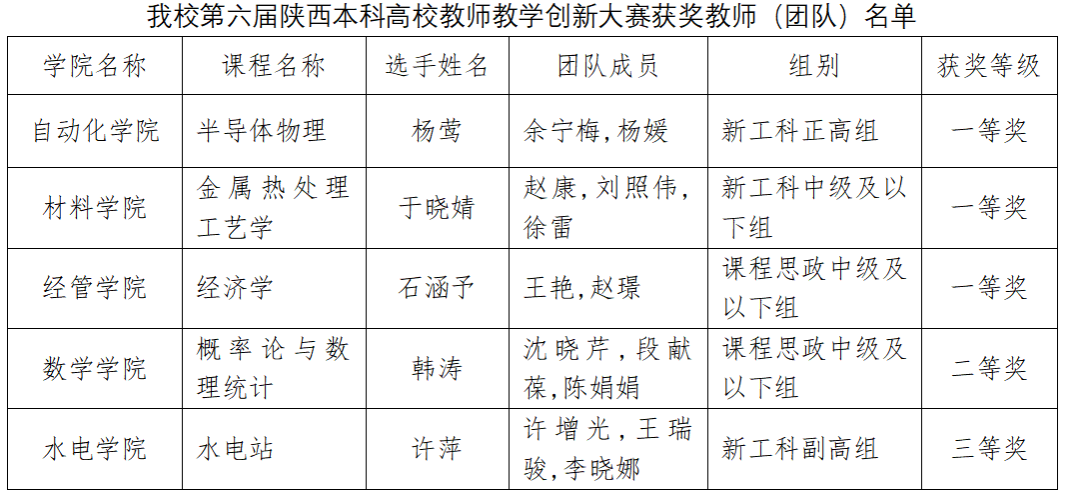 近日,陕西省教育厅公布了第六届陕西本科高校教师教学创新大赛获奖教师(团队)名单。beat365官网教师获一等奖3项,二等奖1项,三等奖1项,一等奖获奖数量位居陕西高校(非部队)第三,课程思政赛道成绩位居该组第一名,新工科正高组首次获得一等奖,取得历史性突破。
