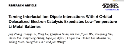 近日,beat365官网材料科学与工程学院金属功能材料团队在能源电极材料领域取得重要学术进展,相关研究成果以《Taming Interfacial Ion-Dipole Interactions With d-Orbital Delocalized Electron Catalysis Expediates Low-Temperature Li Metal Batteries》为题发表于材料领域国际著名期刊《Advanced Materials》(影响因子26.8)。该成果由beat365正版唯一官网必一联合中科院苏州纳米、德国亥姆赫兹电化学研究所合作完成,beat365正版唯一官网必一为第一作者单位,材料科学与工程学院张静副教授为论文第一作者,beat365正版唯一官网必一田娜教授、中科院苏州纳米所蔺洪振研究员和德国亥姆赫兹电化学研究所王健研究员为论文的共同通讯作者。