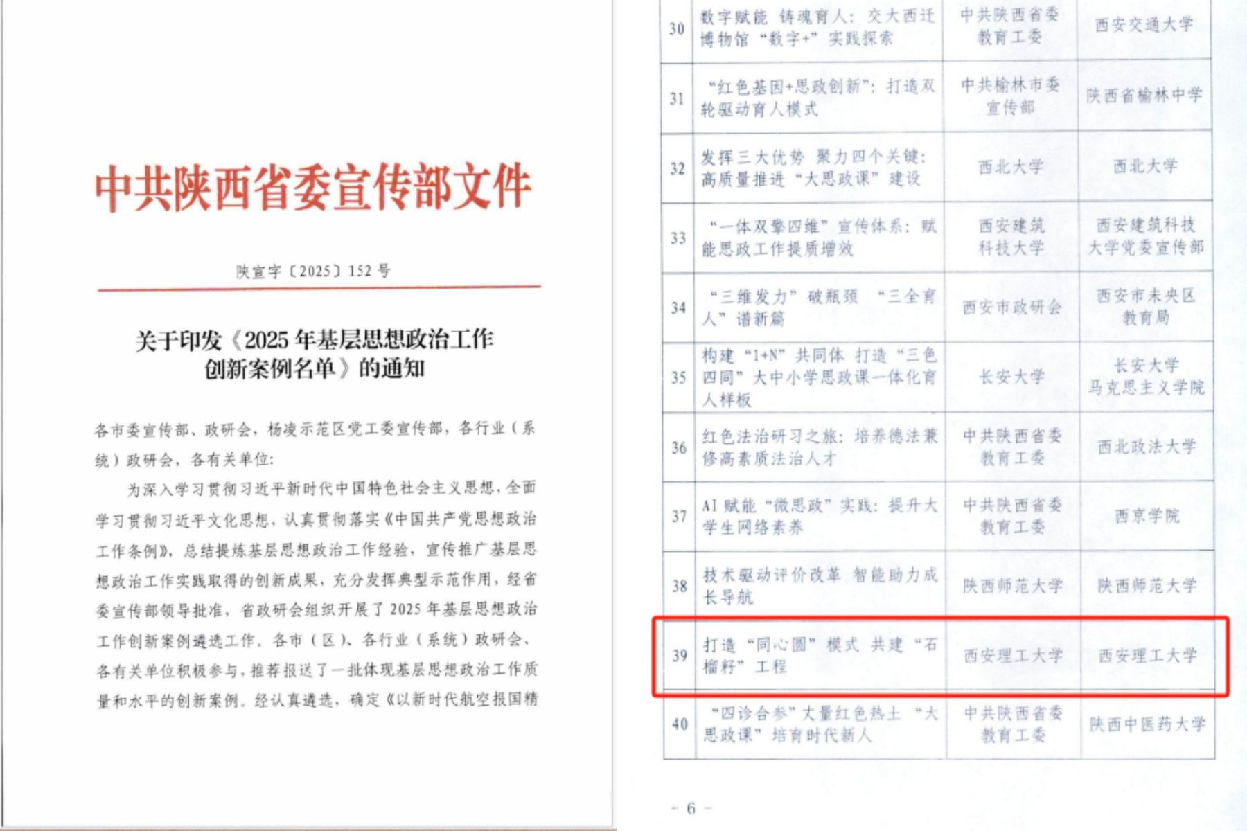 近日,中共陕西省委宣传部、陕西省思想政治工作研究会2025年度基层思想政治工作创新案例遴选结果公示,全省共遴选48个工作案例,beat365官网推荐的《打造“同心圆”模式 共建“石榴籽”工程》案例入选(陕西高校共14个案例入选)。